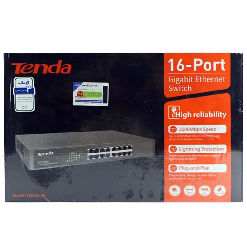 سوییچ TEG1016D شرکت تندا (TENDA)، دارای 16 پورت LAN است و از نوع غیر مدیریتی به شمار میرود. پورتهای به کار رفته در سوییچ از نوع Auto-MDIX و Auto-Negotiation هستند و قادرند به صورت دوطرفه و همزمان به نقل و انتقال اطلاعات بپردازند. جنس بدنهی این سوییچ از فلز است و برای نصب درون رک (Rack) ساخته شدهاست که اصطلاحا رکمونت (Rackmount) نامیده میشوند. پورتهای به کار رفته در این سوییچ از نوع گیگابیتی هستند و با حداکثر سرعت 1000 مگابیت بر ثانیه کار میکنند. ظرفیت سوییچینگ این دستگاه 32 گیگابیت بر ثانیه است و در حالت انتقال دوطرفه اطلاعات (Full-Duplex) کار میکند. در حالت Full-Duplex حداکثر سرعت انتقال سوییچ 2000 مگابیت بر ثانیه خواهد بود. این ظرفیت سوییچینگ باعث میشود سوییچ دچار تراکم کاری و لود سنگین نشود و بتواند به سرعت از پس وظایف برآید. جدول آدرس MAC این سوییچ قابلیت ذخیرهی 8 هزار آدرس دستگاه مختلف را دارا است راهاندازی دستگاه به صورت Plug and Play است و بدون انجام تنظیمات اولیه میتوان از آن استفاده کرد.