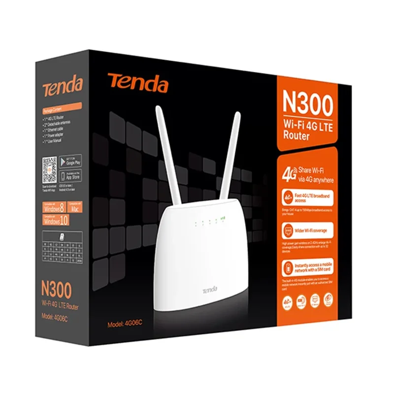 شما میتوانید از قابلیت بیسیم این دستگاه در فرکانس 2.4 گیگاهرتز استفاده کنید یا در صورت نیاز، یکی از دو پورت LAN آن را به خدمت بگیرید. در پنل پشتی مودم روتر، 2 عدد پورت LAN وجود دارد که یکی از آنها پورت LAN/WAN است. این پورت به شما کمک میکند دستگاههایی از قبیل مودم کابلی (فاقد قابلیت وایرلس) را به این دستگاه جدید وصل و به کمک آن حتی از اینترنت ADSL هم استفاده کنید. تندا برای محصول فعلی ، 2 آنتن جداگانه ای را در نظر گرفته ودارای آنتن داخلی نیز می باشد. برای استفاده از Tenda 4G06c تنها کافی است که سیم کارت خود را در مکان مشخص گردیده قرار دهید. و به کمک آداپتور 9 ولتی موجود در جعبه، محصول آن را به برق شهری متصل کنید. بدون شک مودم Tenda 4G06c یک محصول حرفه ای است.