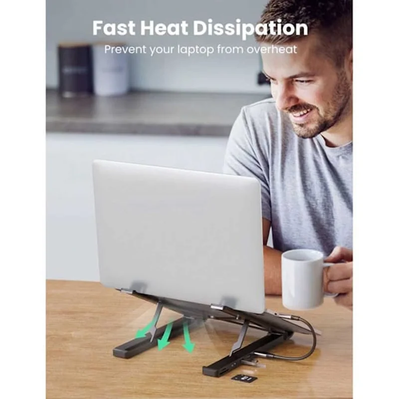 پایه نگهدارنده لپ تاپ و هاب 5 پورت یوگرین مدل CM359 به یک هاب 5 پورت مجهز شده است که شامل یک سه پورت USB 3.0، یک پورت HDMI، شیار کارت TF و یک شیار کارت SD است. با استفاده از این هاب، میتوانید به راحتی لوازم جانبی مختلف مانند کیبورد، موس، هارد اکسترنال، نمایشگر و کارت حافظه را به لپ تاپ خود متصل کنید. دیگر نیازی به استفاده از چندین هاب و کابل مجزا نیست و میتوانید با نظم و آراستگی بیشتری به کار خود ادامه دهید.